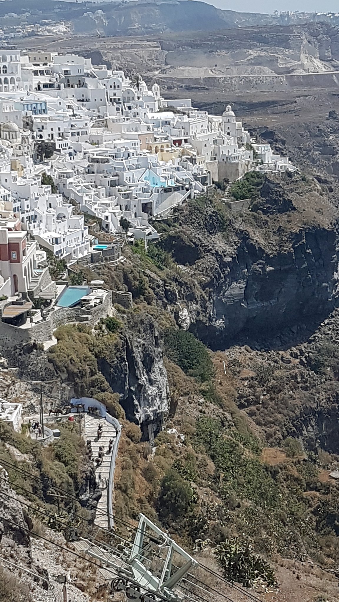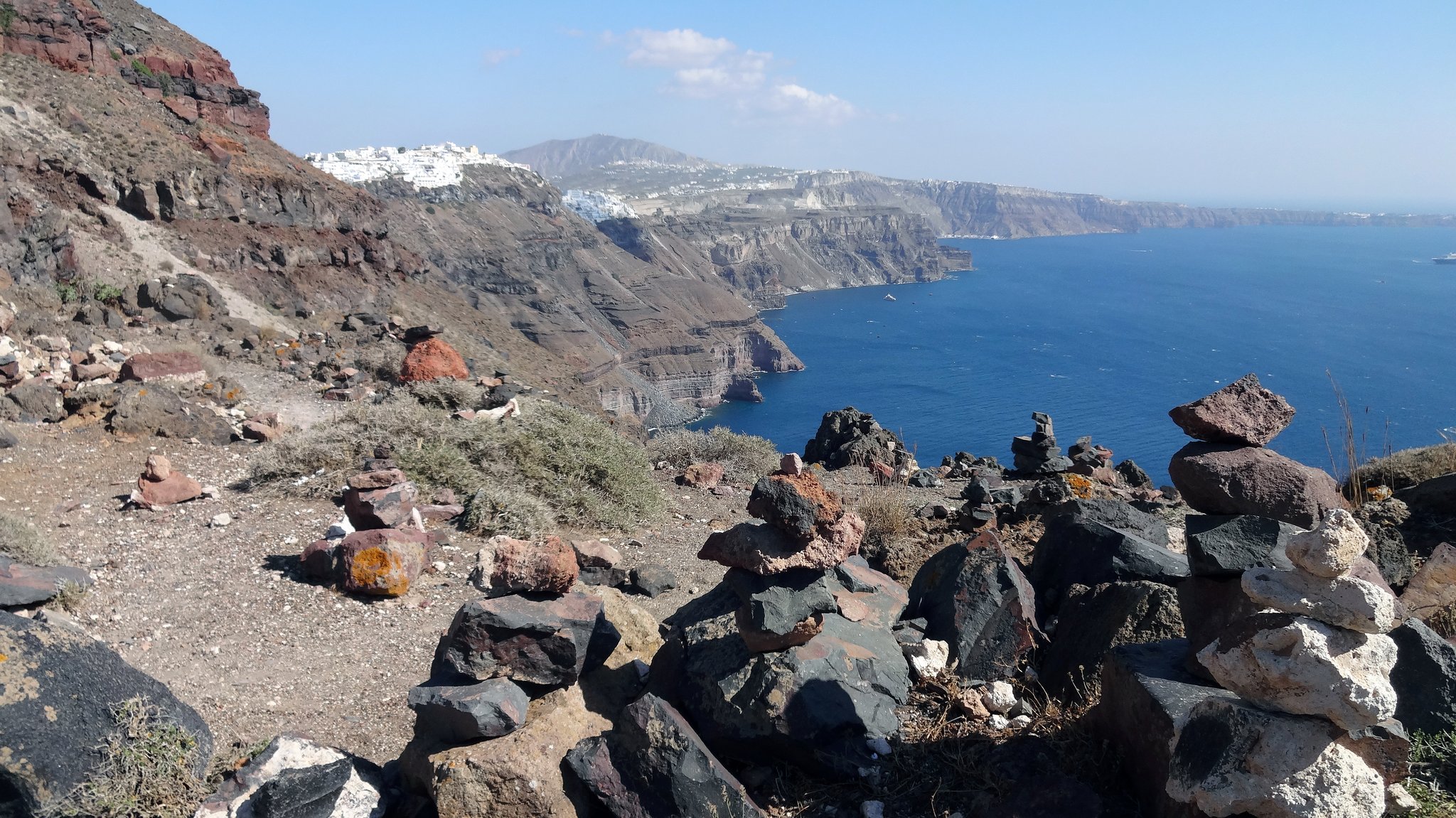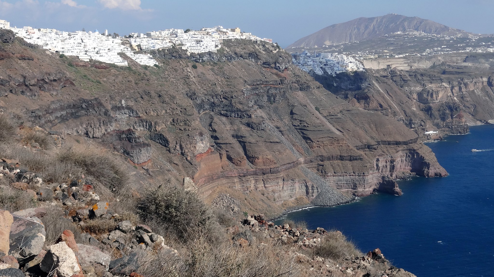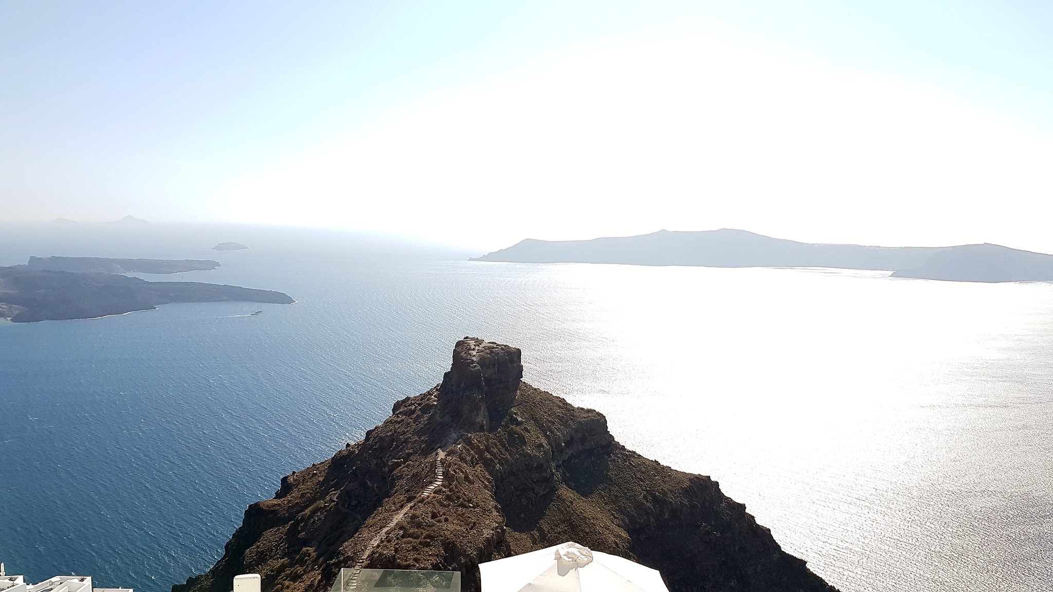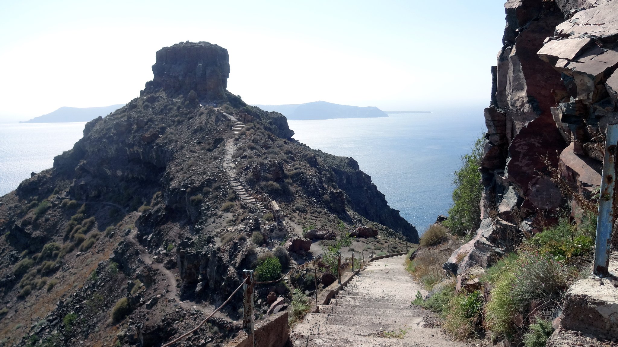 SKAROS ROCK IMEROVIGLI - direkt vor unserer Terrasse. Die Ruinen von Skaros sind heute ein beliebtes Ausflugsziel für Wanderer und Fotografen; die Landzunge ist über Imerovigli zu erreichen. Kein einfacher Auf- und/oder Abstieg und gutes Schuhwerk ist ein Must. Stefan hat den Skaros Rock bezwungen.