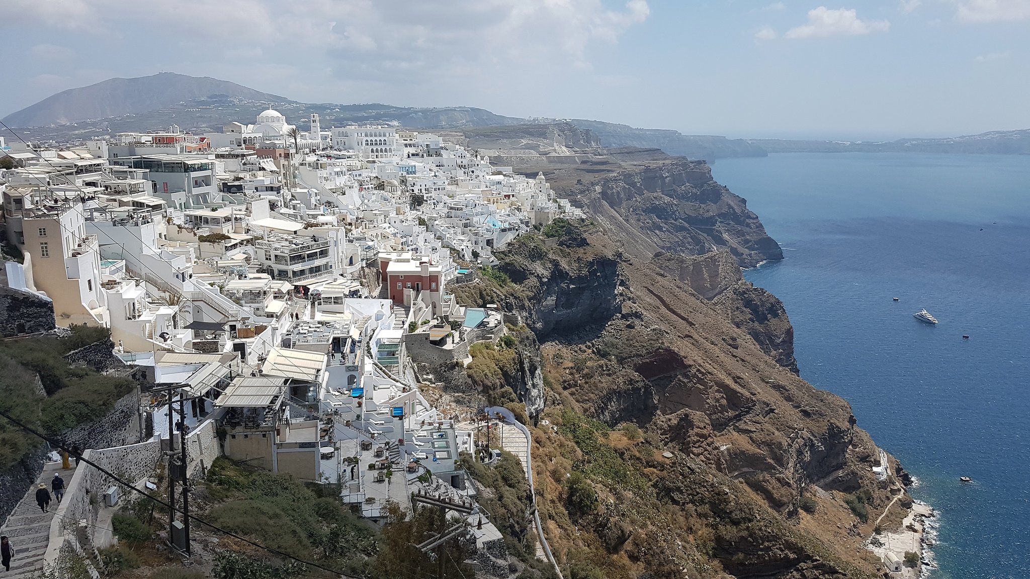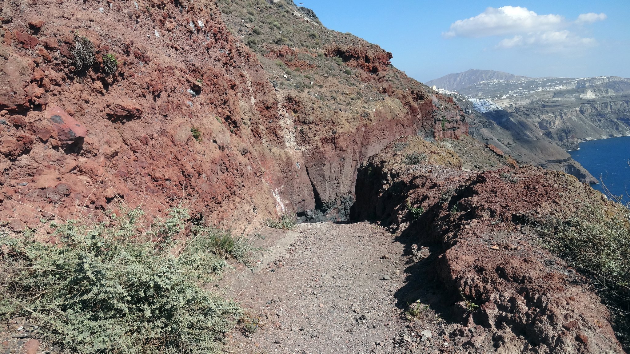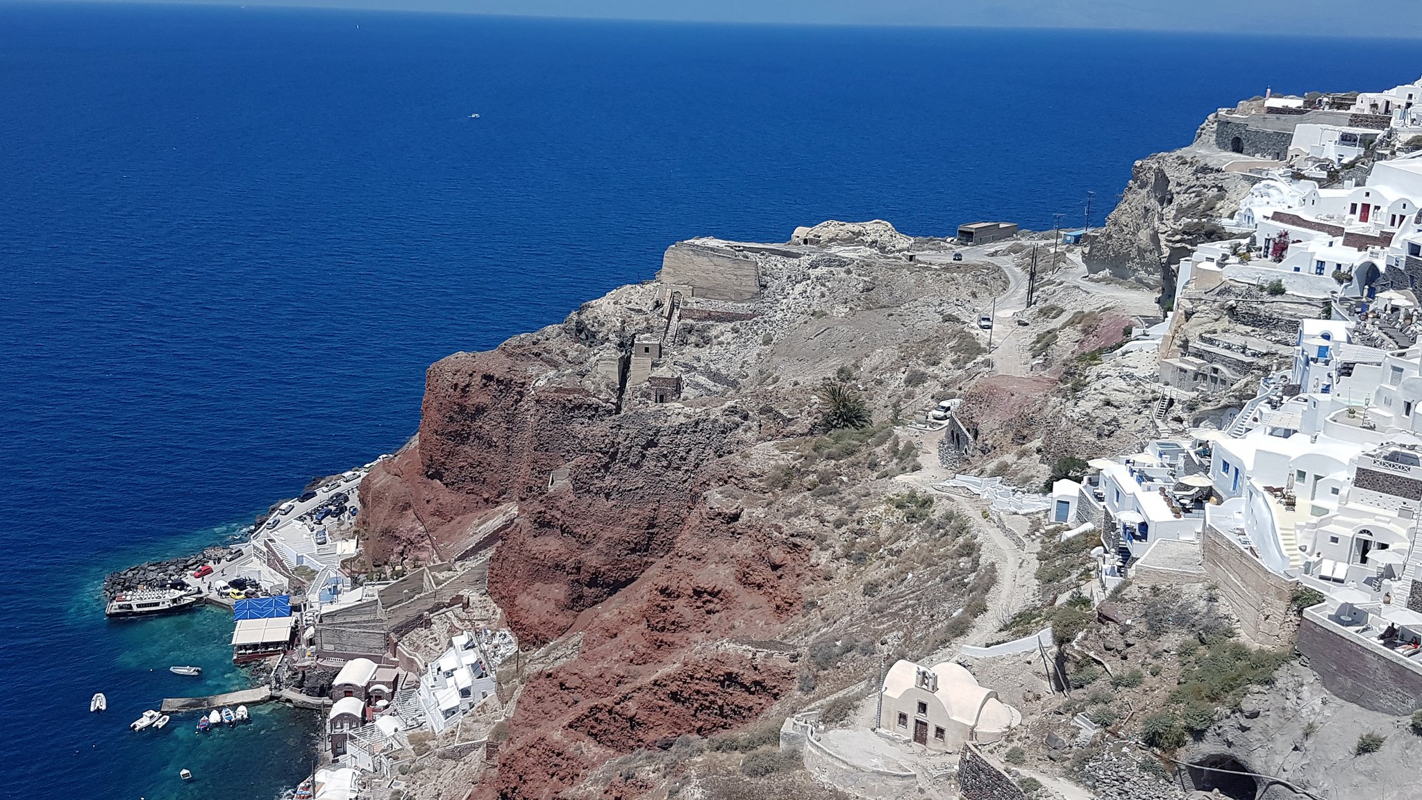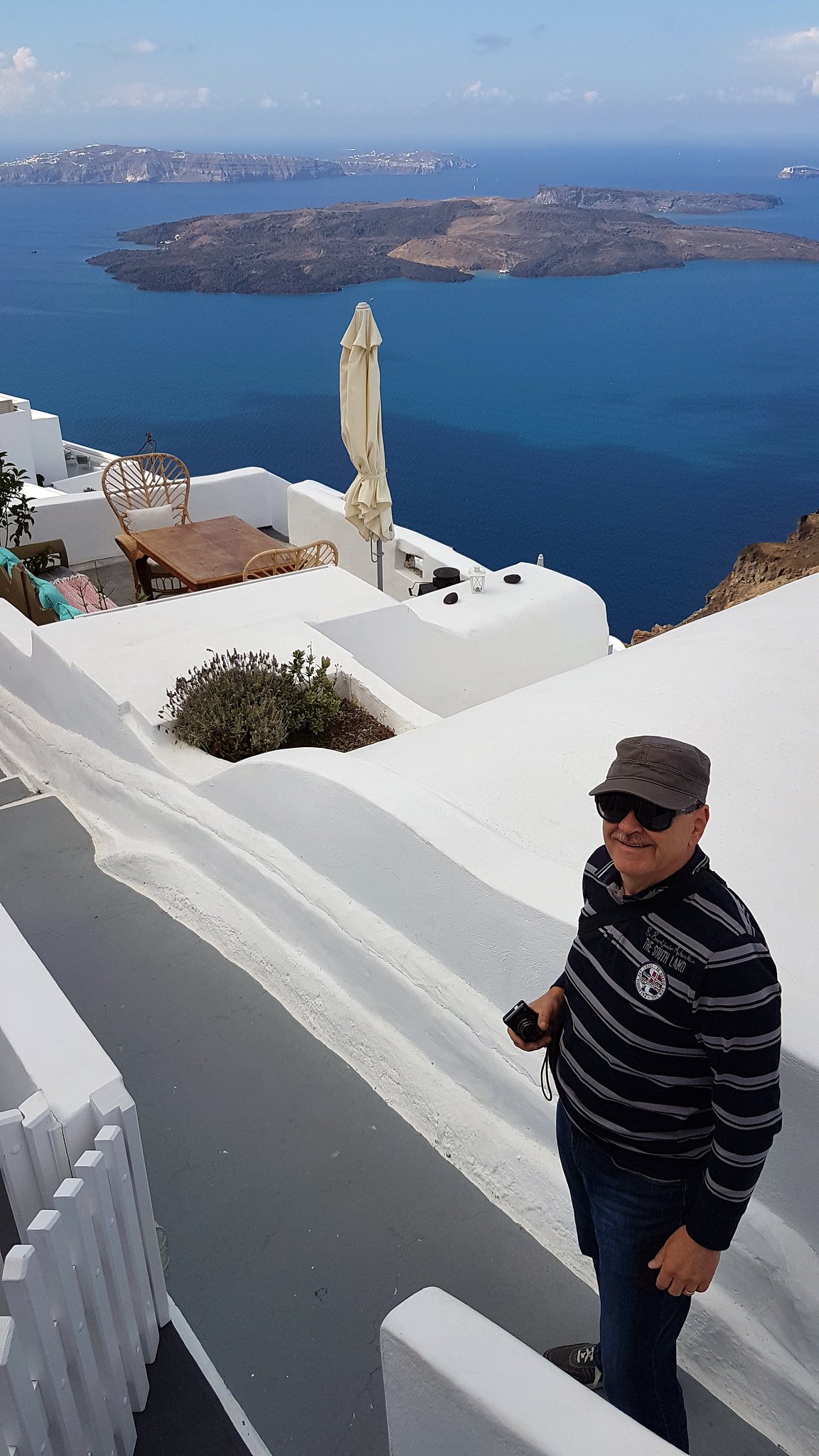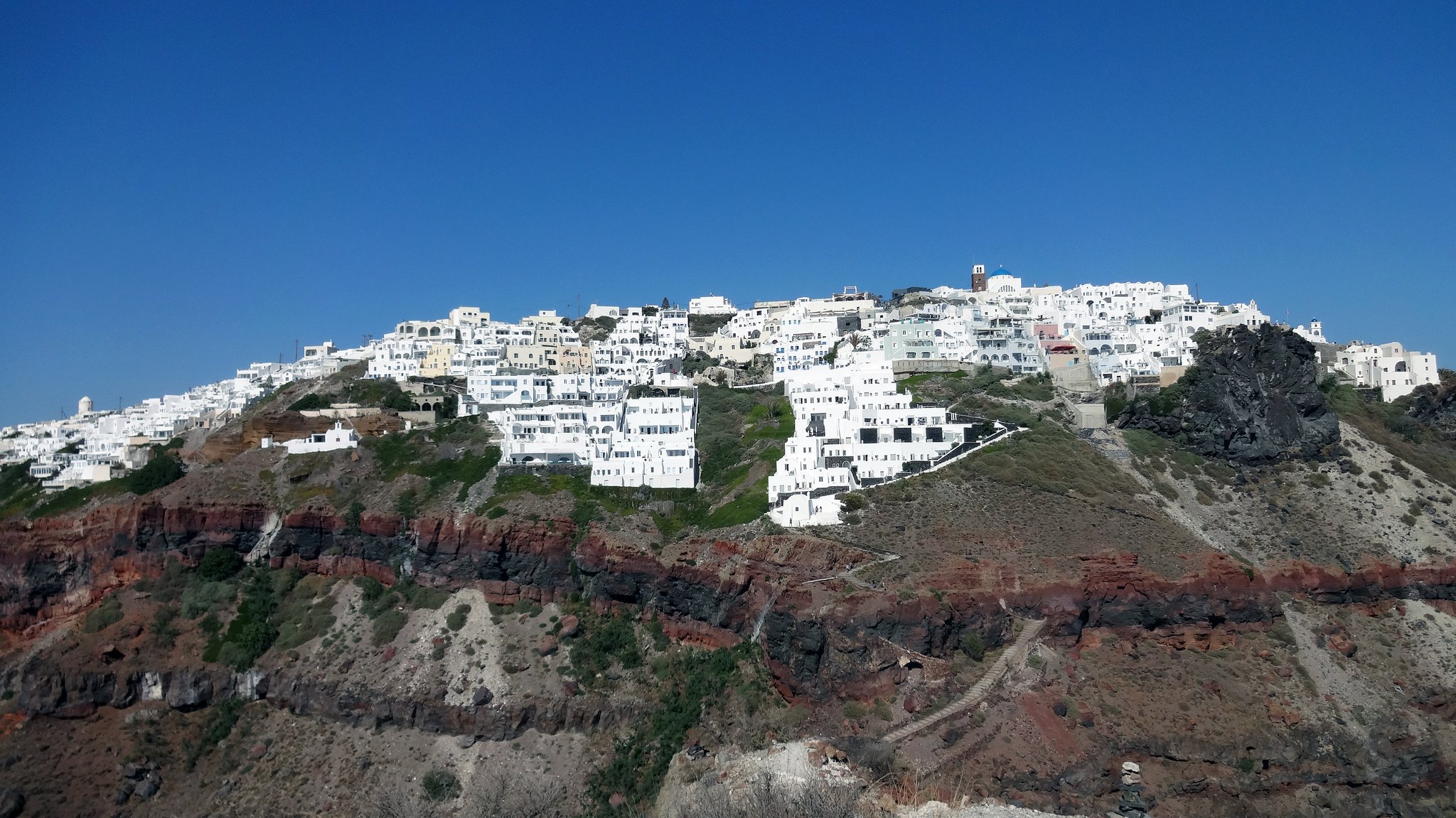 SKAROS ROCK IMEROVIGLI - direkt vor unserer Terrasse. Die Ruinen von Skaros sind heute ein beliebtes Ausflugsziel für Wanderer und Fotografen; die Landzunge ist über Imerovigli zu erreichen. Kein einfacher Auf- und/oder Abstieg und gutes Schuhwerk ist ein Must. Stefan hat den Skaros Rock bezwungen.