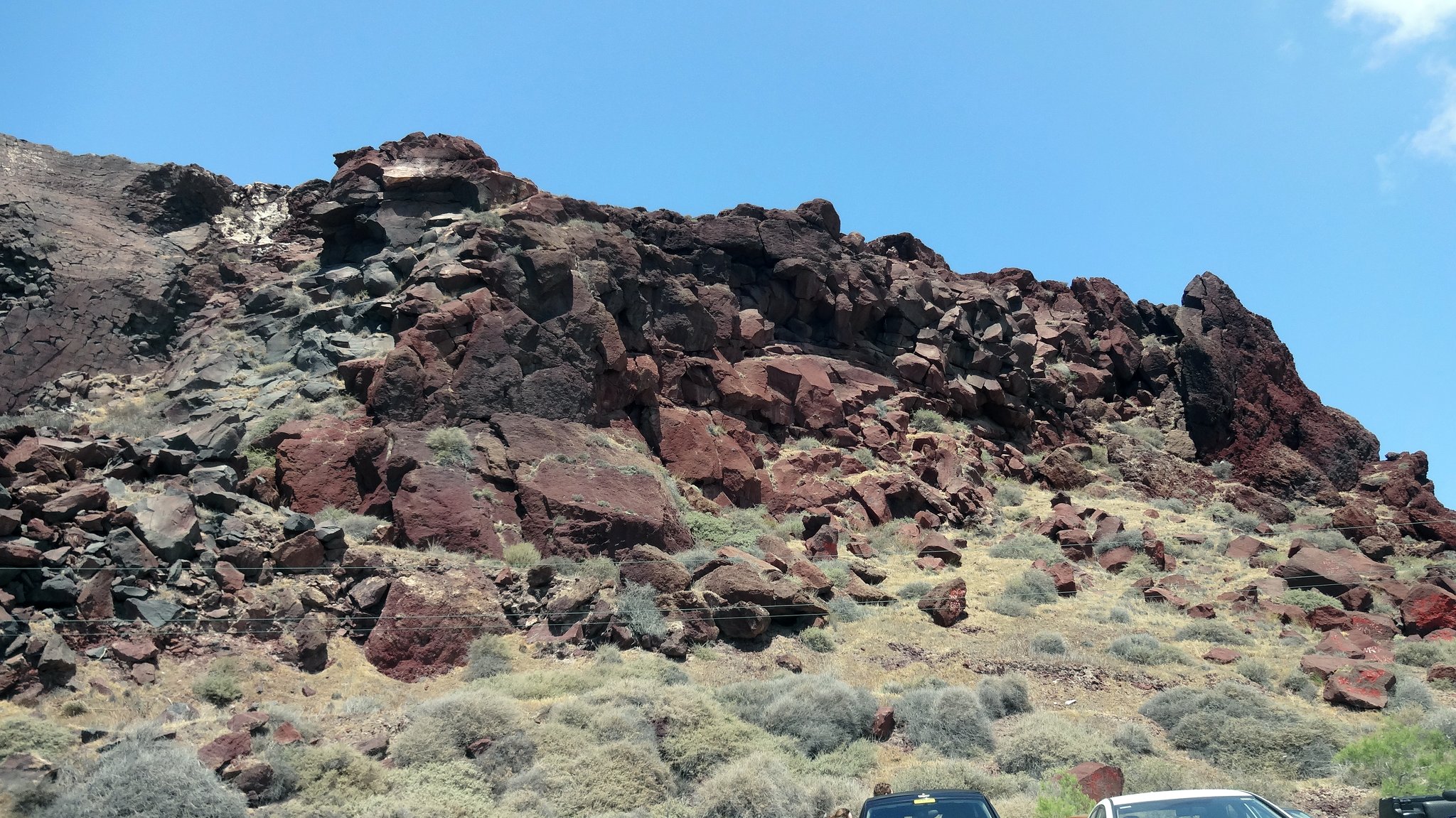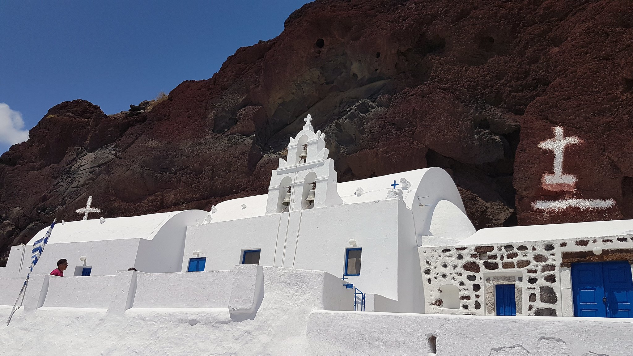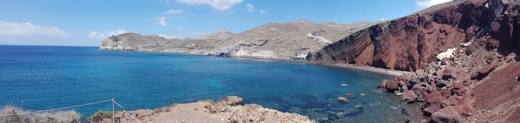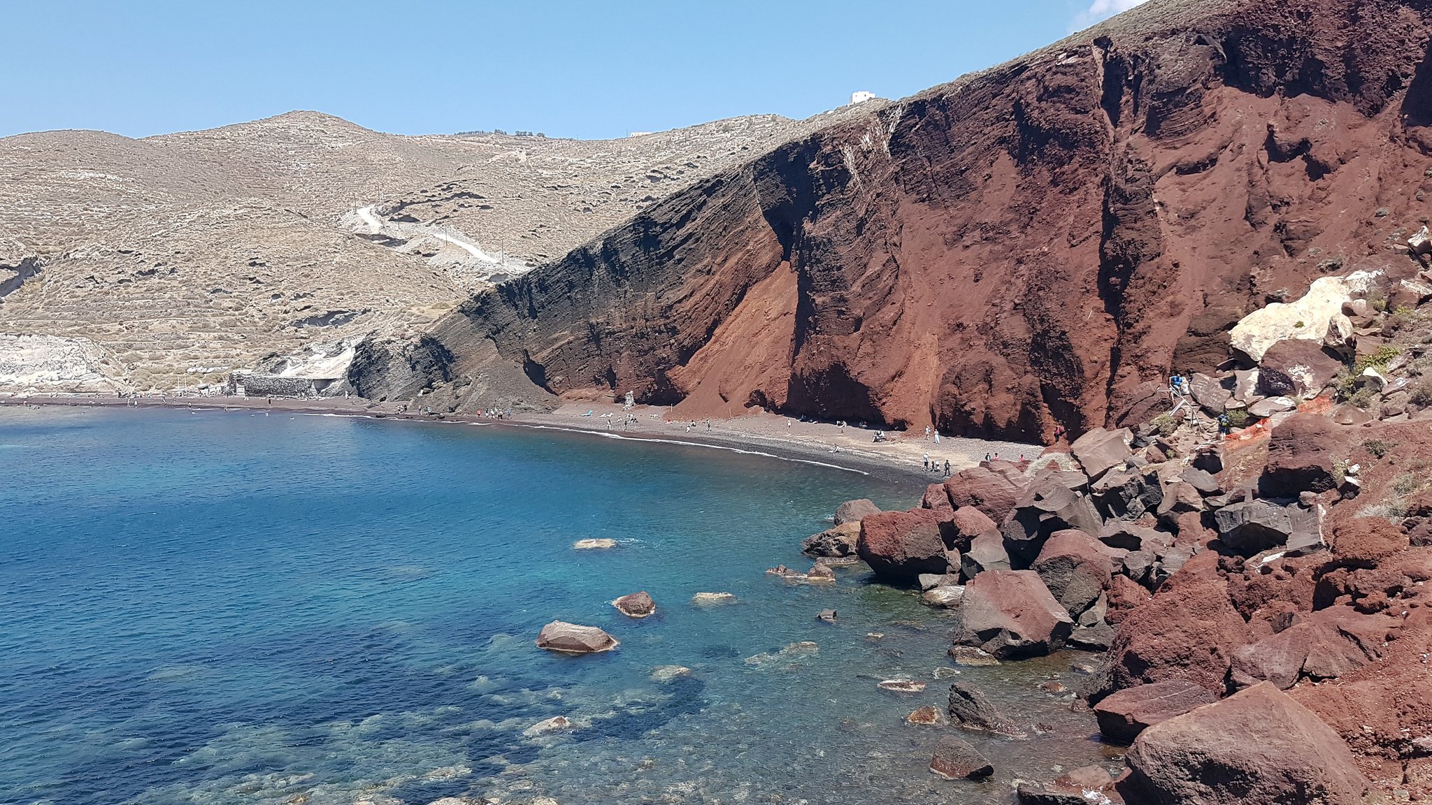 ROTER STRAND VON SANTORINI - wird auch Kokkini Ammos genannt - die rote Farbe des Strandes ist auf die Lava-Steilküste zurückzuführen. Der Strand liegt ca. 12 km südwestlich von der Hauptstadt Fira.