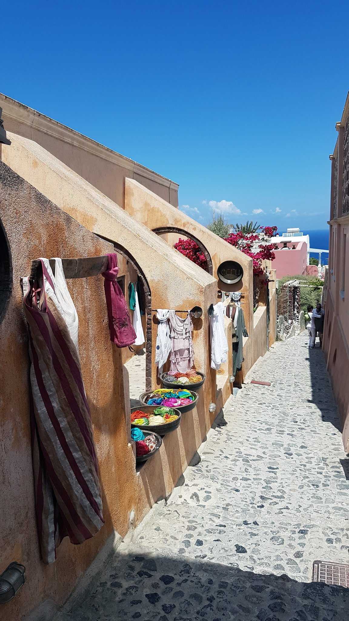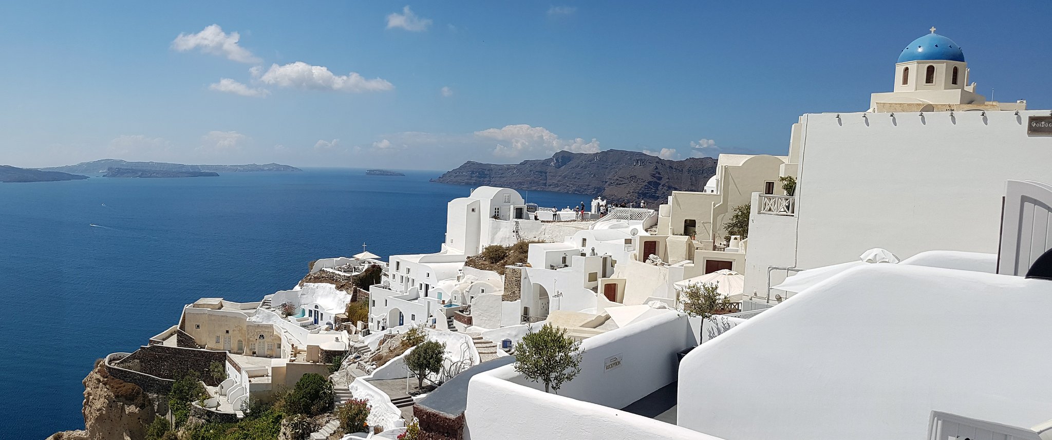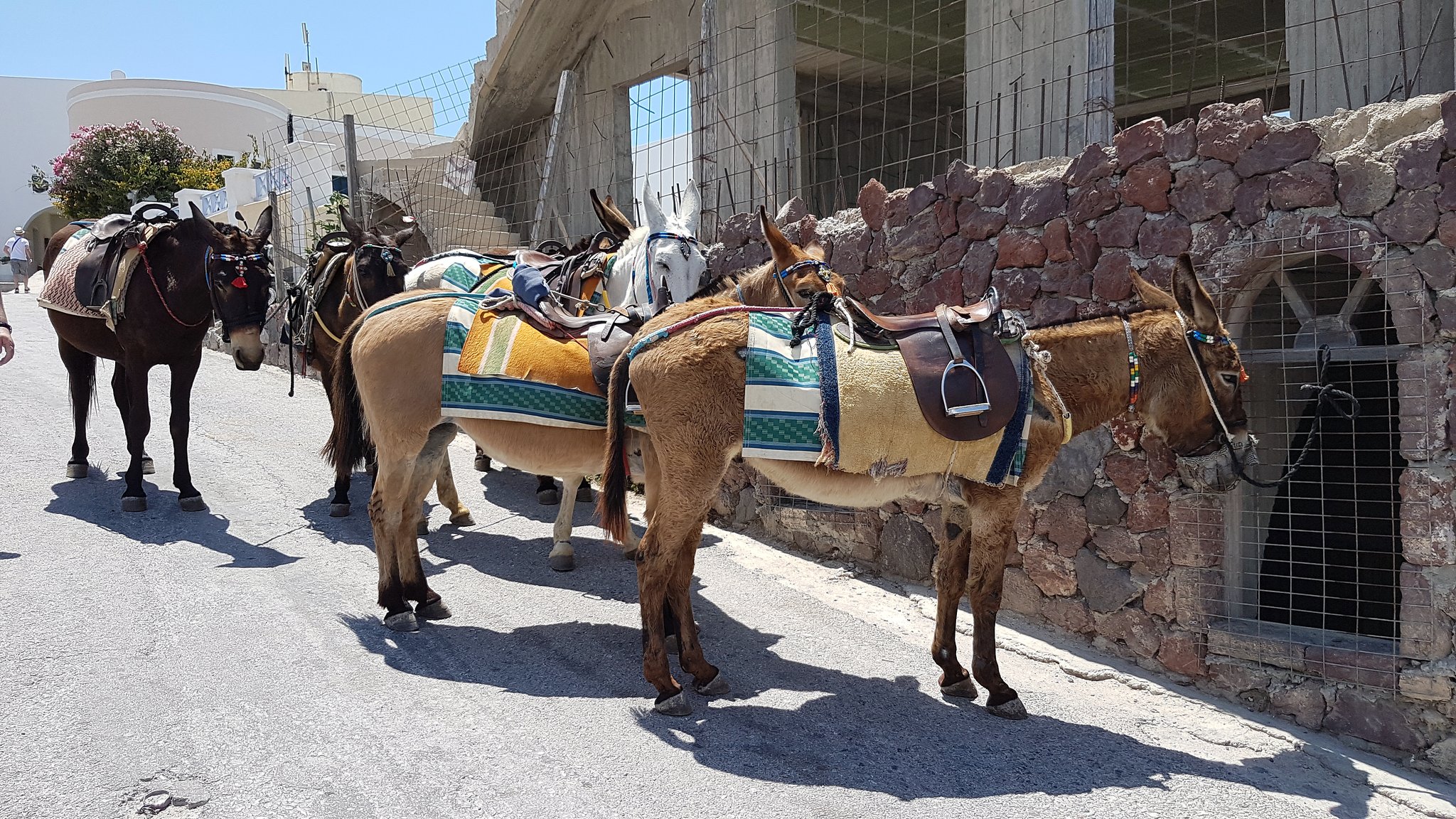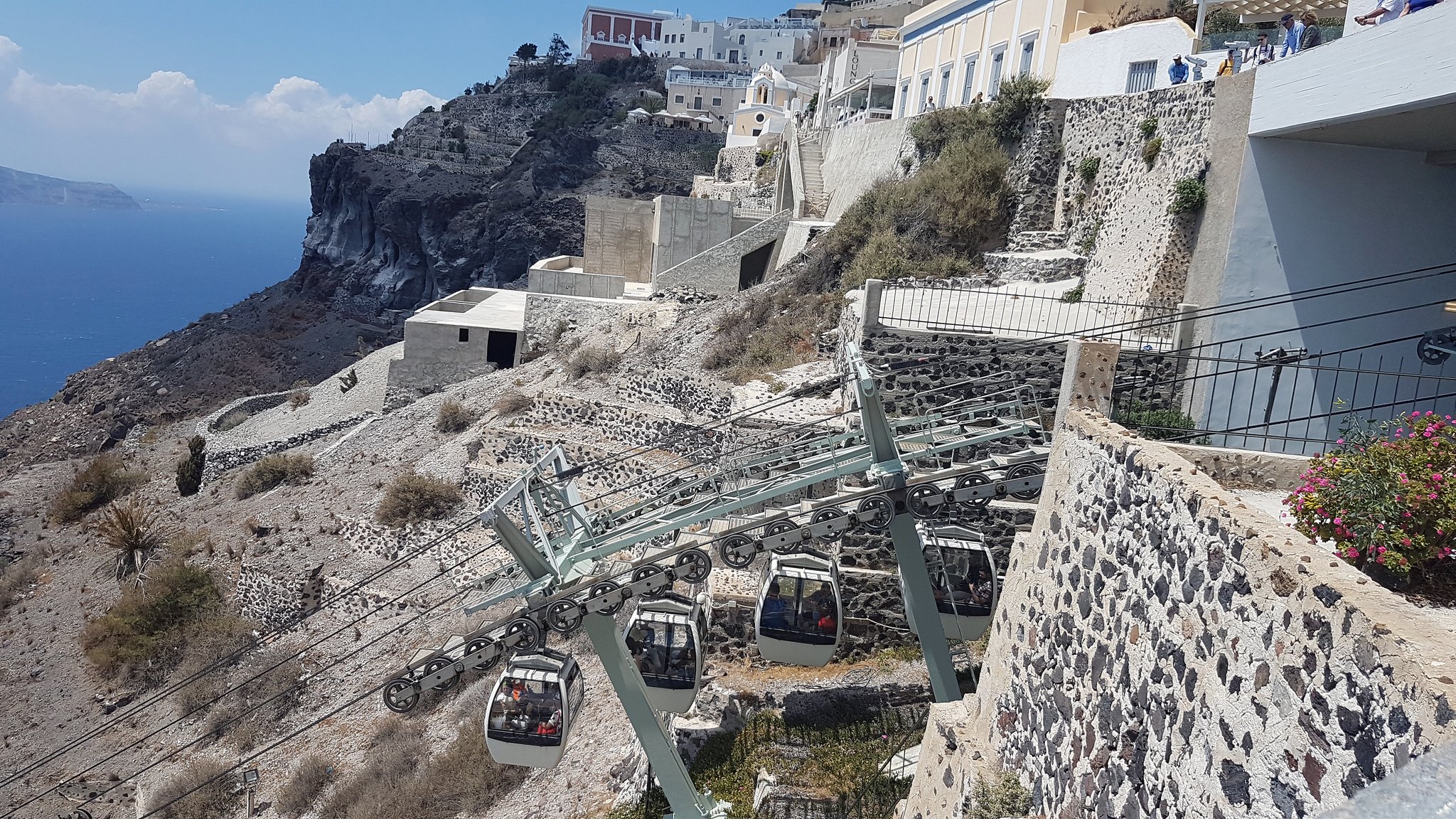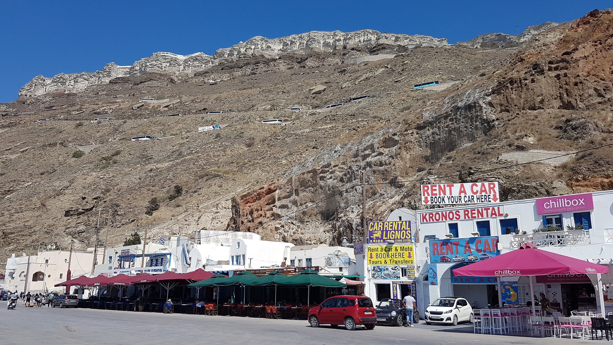 FIRA (Thira) - der bekannteste Ort auf Santorini - Anlegestelle der grossen Kreuzfahrtschiffe und geprägt von teuren Geschäften und Luxushotels. Es führt ein Fussweg am Kraterrand hinab zu einem kleinen Hafen - entweder zu Fuss, per Seilbahn oder Maultier.