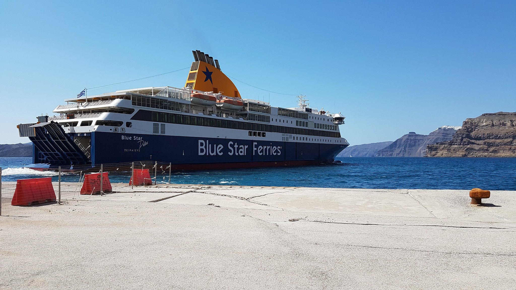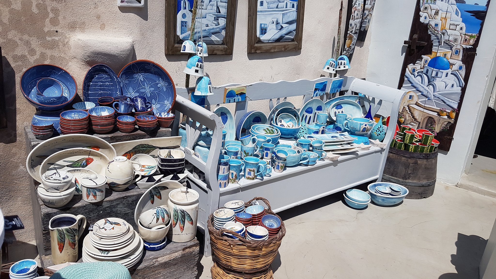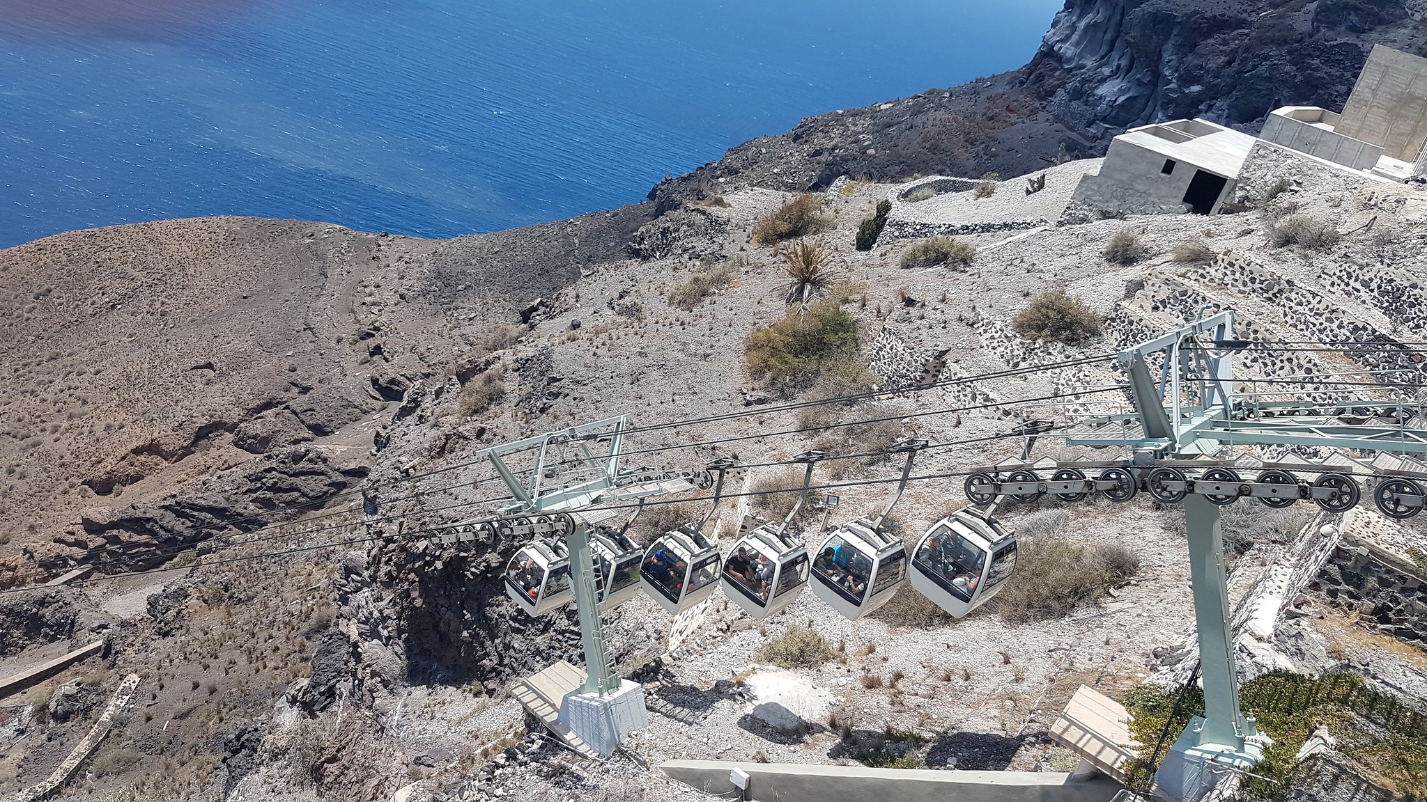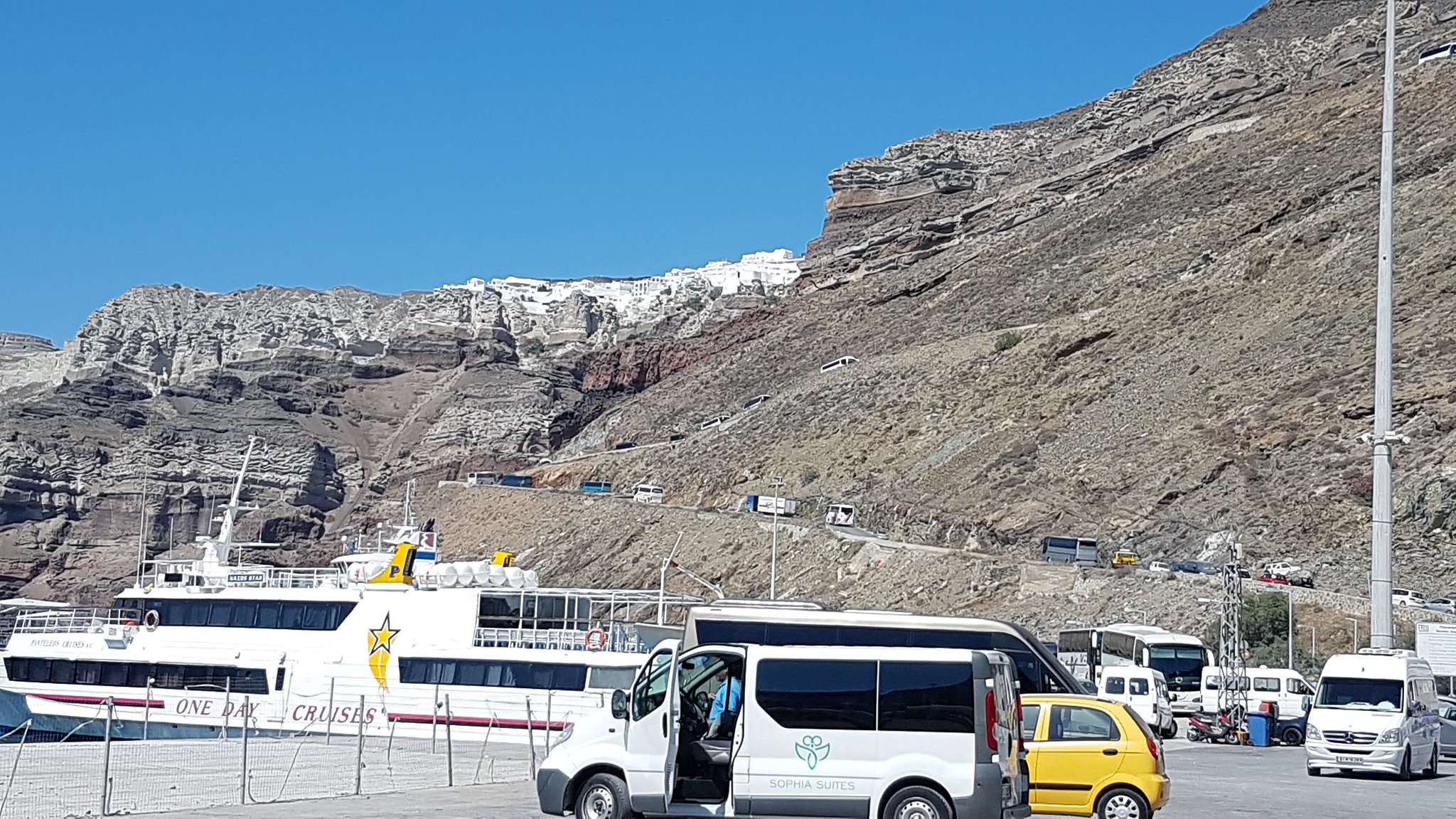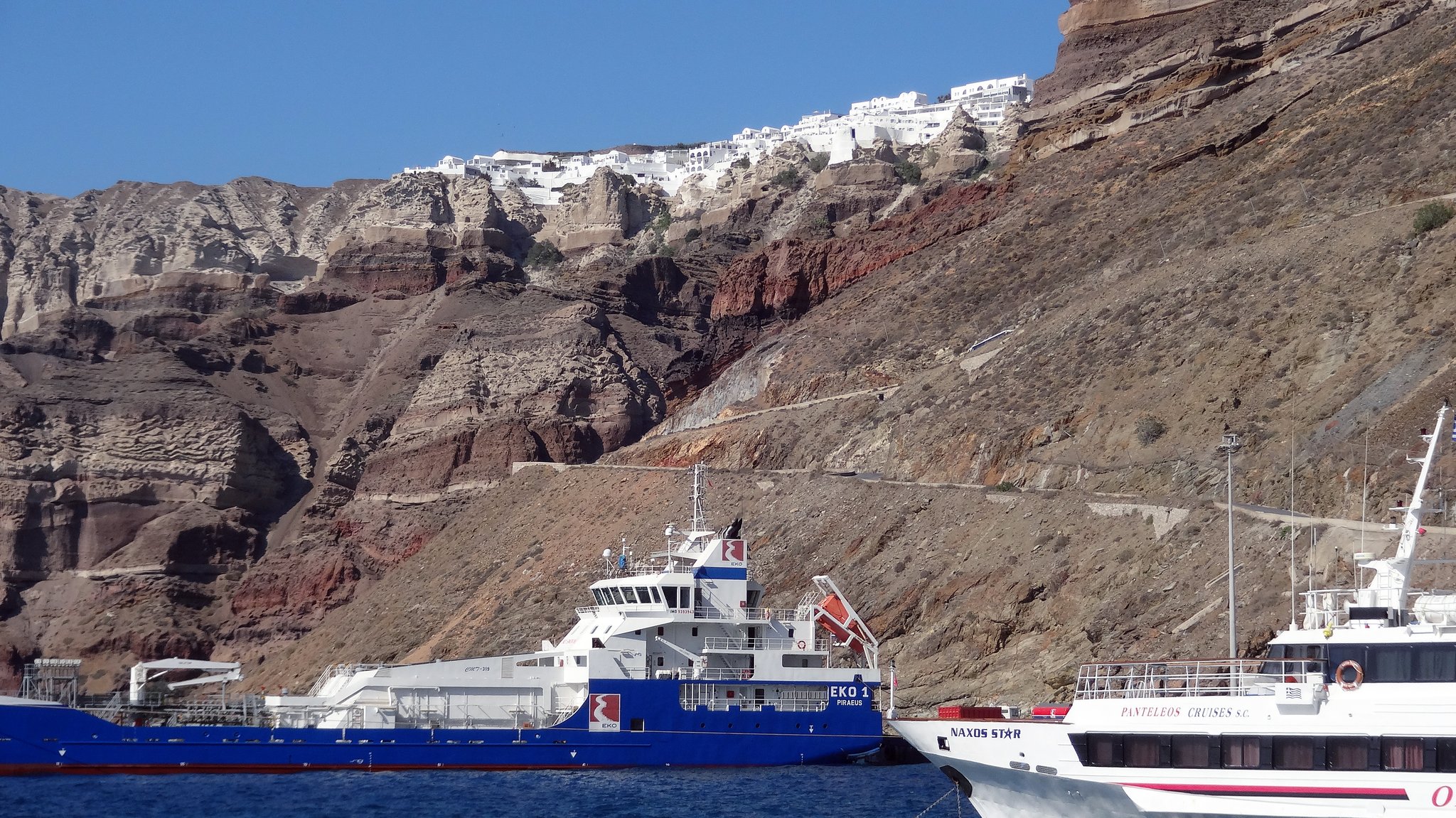 FIRA (Thira) - der bekannteste Ort auf Santorini - Anlegestelle der grossen Kreuzfahrtschiffe und geprägt von teuren Geschäften und Luxushotels. Es führt ein Fussweg am Kraterrand hinab zu einem kleinen Hafen - entweder zu Fuss, per Seilbahn oder Maultier.